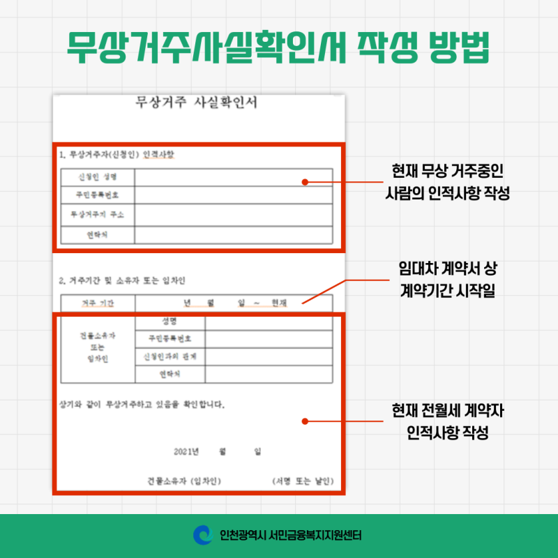 무상거주 사실확인서 작성 시에는 다음과 같은 사항들을 정확하게 기재해야 합니다: