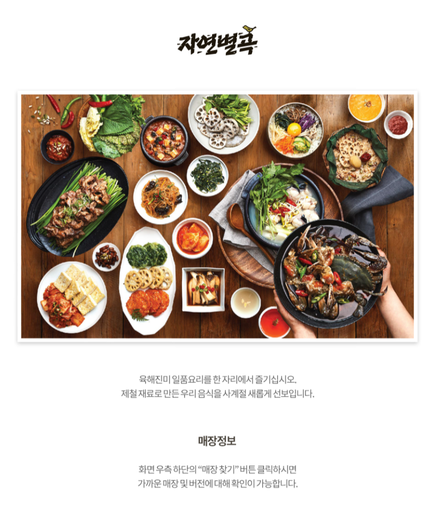 자연별곡은 고객의 건강과 만족을 최우선으로 생각합니다. 2025년에도 변함없는 품질과 서비스로 여러분을 맞이하겠습니다. 더욱 풍성해진 메뉴와 혜택으로 특별한 식사 시간을 만끽하세요.